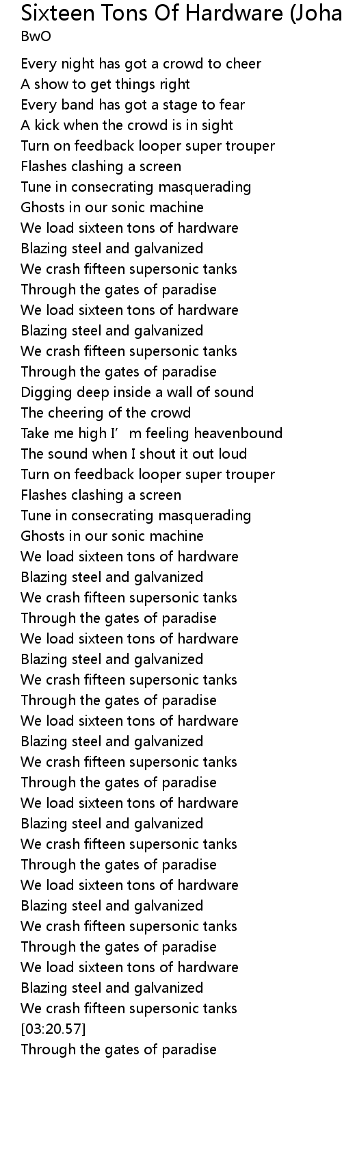 | [02:56.40] | We load sixteen tons of hardware |