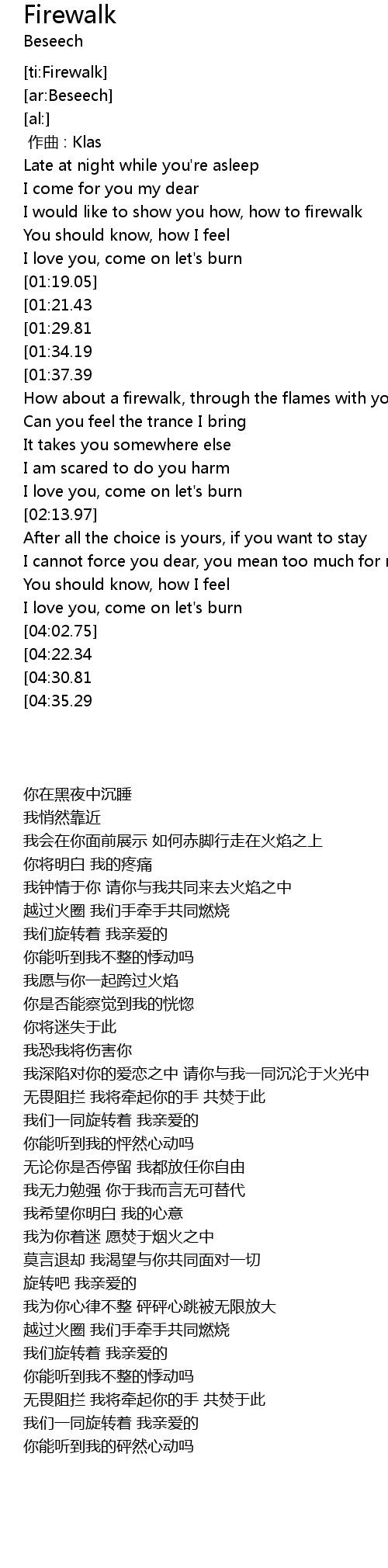 | [04:39.78][04:22.34][04:04.94] | Get inside my firecircle, hand in hand we burn |