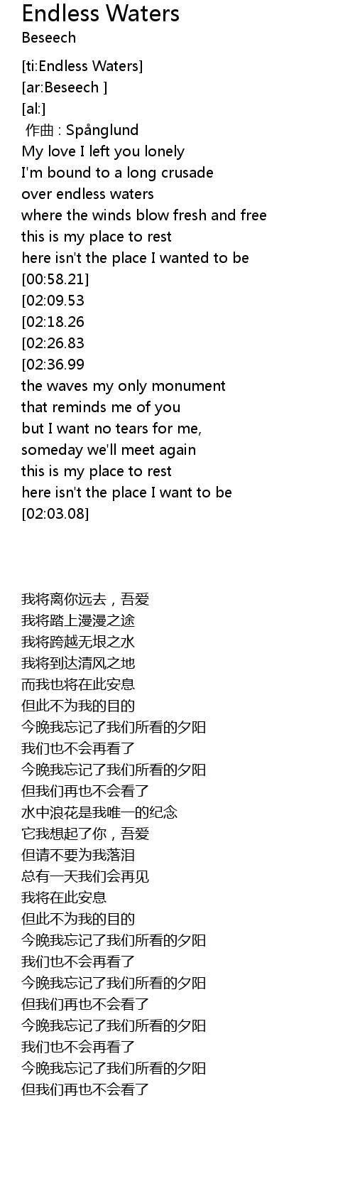 | [03:03.68][02:09.53][01:00.36] | I' ve even lost our twilight tonight my dear |