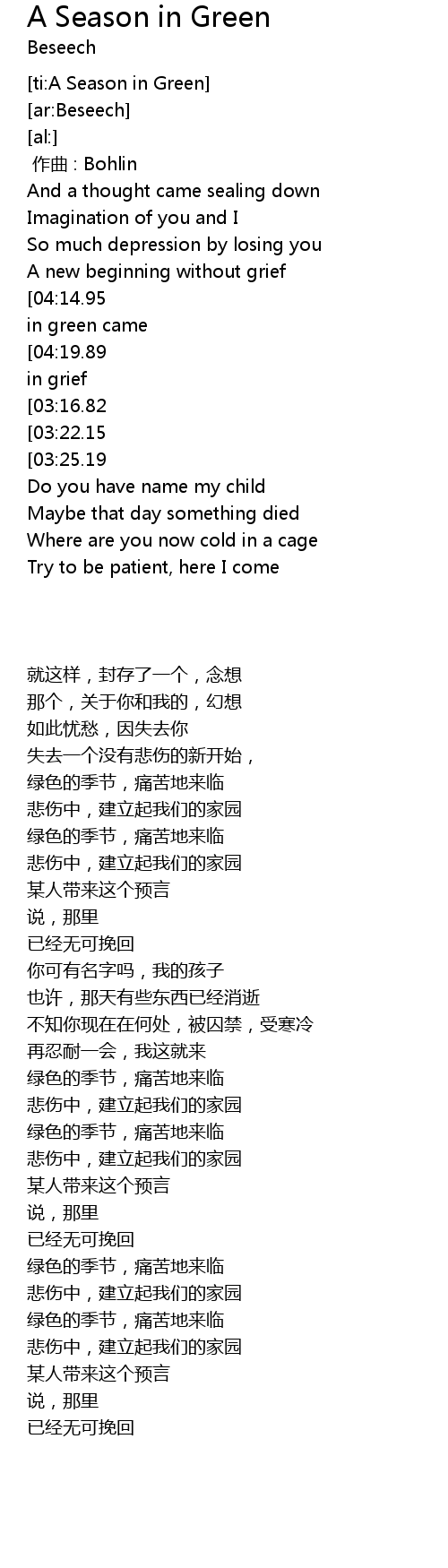 | [04:25.31][04:14.95][03:06.10][02:55.43][01:41.82][01:31.34] | Painfully a season in green came |
