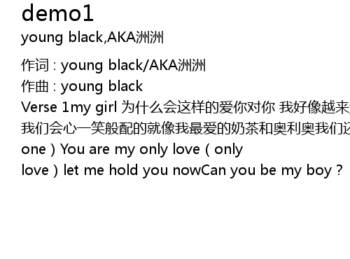 | Verse 1my girl 为什么会这样的爱你对你 我好像越来越卖力所以 希望你能对我保持在意别怕 那些麻烦向你来袭我们之间已经没有什么秘密早就懂得思念你的意义可能这个过程有点戏剧但我每天都在回想你的气息他们说恋人需要互相付出才能解决周围潜在的孤独可是由我一个人努力突出你也可以在心房随便出入过分的爱你是我自愿紧紧的抱你能够实现照顾你的时间不会迟延更不存在禁锢人的期限baby girl 爱你的感觉特别浓重突然失去你的消息整个人变得空空才说你在我生命里的位置超级中用你的样子已经印满了我的瞳孔hook:baby 这首歌只想让你心动做我的honey 和你互相捉弄不会失控感情很甜蜜 一不小心又将我击中此刻我只想对你biu biu biuverse 2 你总是傻傻的叮嘱我多喝热水在你心里我也永远都是最美过程平平淡淡 但你我都知道从不理睬到很在意变成日常嗜好这种感觉特别的奇妙 慢慢你把我当做成了依靠让我把情话制造 我们会心一笑般配的就像我最爱的奶茶和奥利奥我们还有很长的未来 你在我心里永远都 是 都是最乖那些女孩总 是 总是在乱猜不好意思 这是洲洲 他的最爱不止想在你心里 成为你唯一的芭比和你一起回家 见见我的未来妈咪新鲜的**只有我能体会让羡慕嫉妒的girls都统统闭嘴hook:baby 这首歌我只想让你心动做我的honey 和你互相捉弄不会失控感情很甜蜜 一不小心又将我击中此刻我只想对你biu biu biuYou are my only one (only one)You are my only love(only love)let me hold you nowCan you be my boy? hook:baby 这首歌只想让你心动做我的honey 和你互相捉弄不会失控感情很甜蜜 一不小心又将我击中此刻我只想对你biu biu biu |