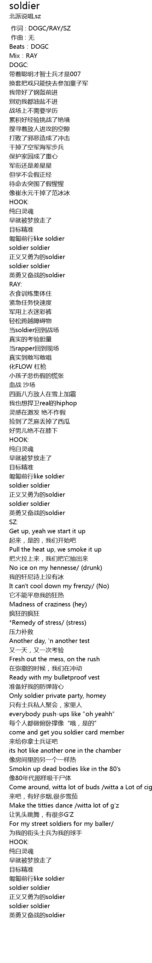 | [01:54.257] | yīng yǒng yòu fèn zhàn de soldier |