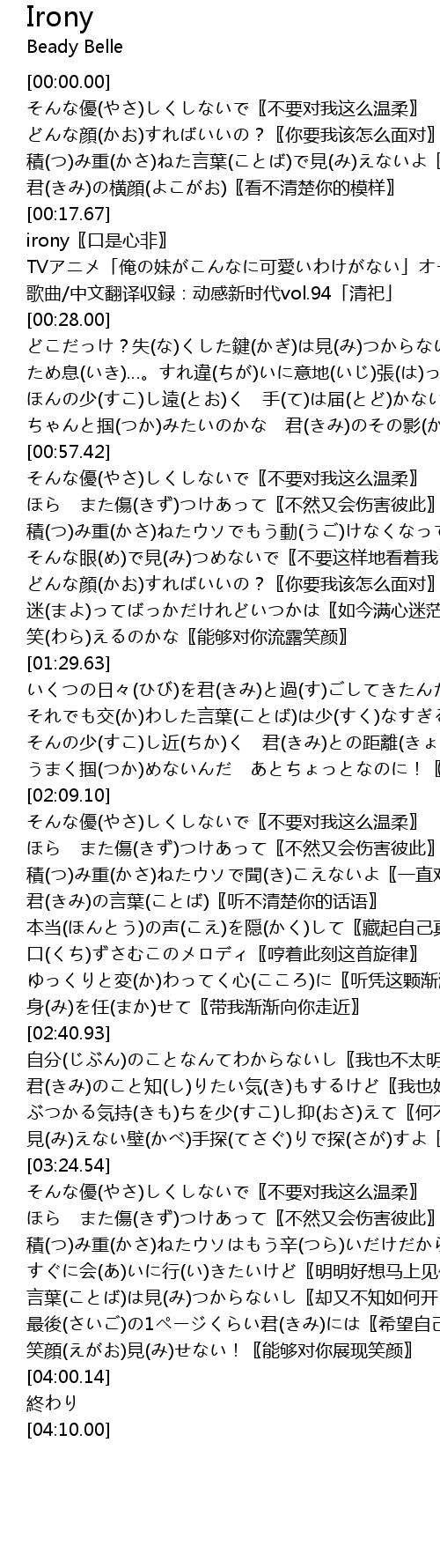 | [00:20.00] | TVアニメ「俺の妹がこんなに可愛いわけがない」オープニングテーマ〖TV动画「我的妹妹哪有这么可爱!」OP〗 |