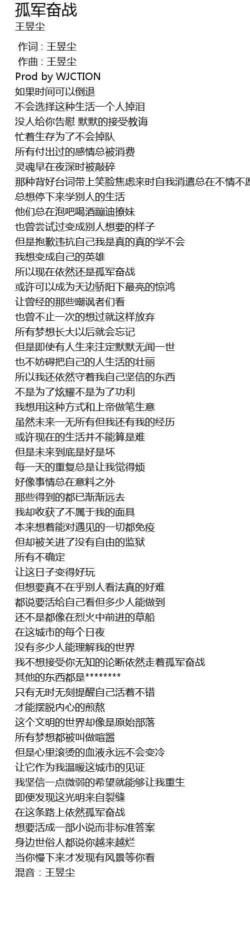| [01:46.951] | wǒ bù xiǎng jiē shòu nǐ wú zhī de lùn duàn yī rán zǒu zhe gū jūn fèn zhàn |