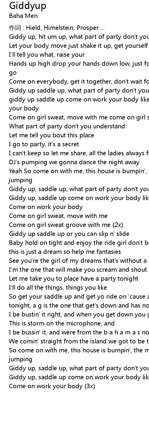 | Giddy up saddle up, what part of party don't you understand, work your body, giddy up saddle up come on work your body like you know you can, come on work your body | |