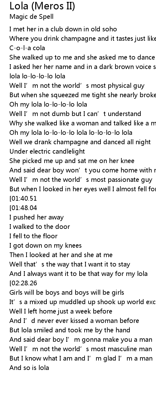 | [00:23.64] | I asked her her name and in a dark brown voice she said lola L-o-l-a lola lo-lo-lo-lo lola |
