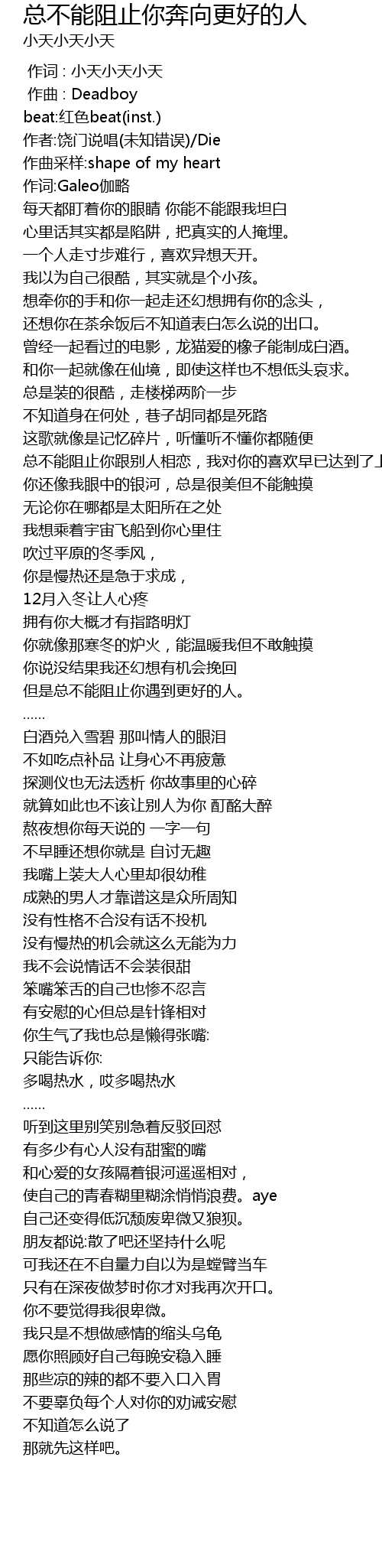 | [01:43.027] | dàn shì zǒng bù néng zǔ zhǐ nǐ yù dào gèng hǎo de rén. |