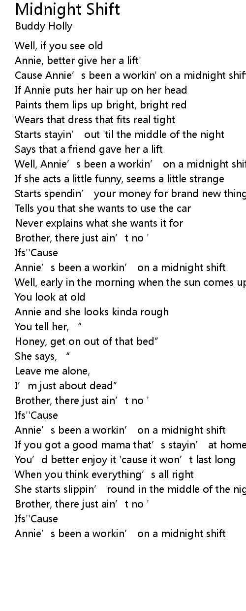 | Well, Annie’s been a workin’ on a midnight shift | |