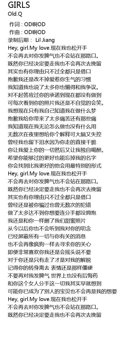 | [01:09.401] | Hey, girl. My love. xiàn zài wǒ yě sōng kāi shǒu |
