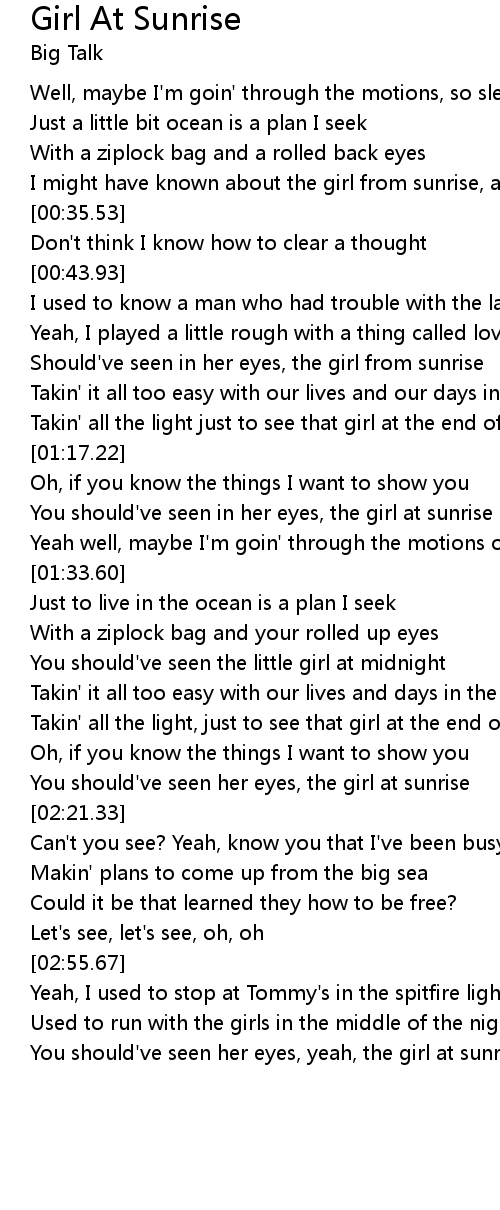 | [03:14.62] | You should've seen her eyes, yeah, the girl at sunrise |