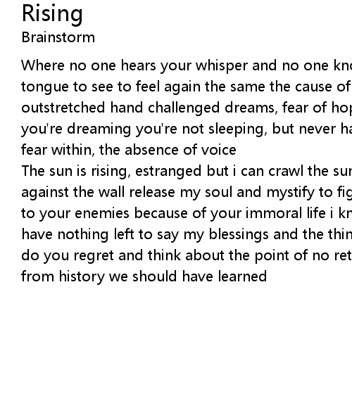 | The sun is rising, estranged but i can crawl the sun is rising, with my back against the wall release my soul and mystify to fight my violent lies betray you to your enemies because of your immoral life i know you thought i'd turn away, have nothing left to say my blessings and the things you hide, it happens anyway do you regret and think about the point of no return words not to be ignored from history we should have learned |