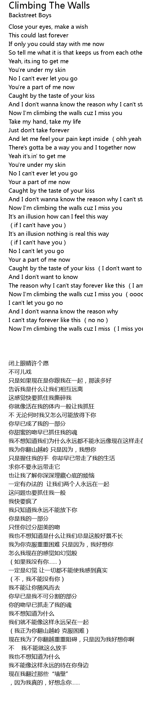 | [02:52.410] | The reason why I can' t stay forever like this I am climbing the walls |