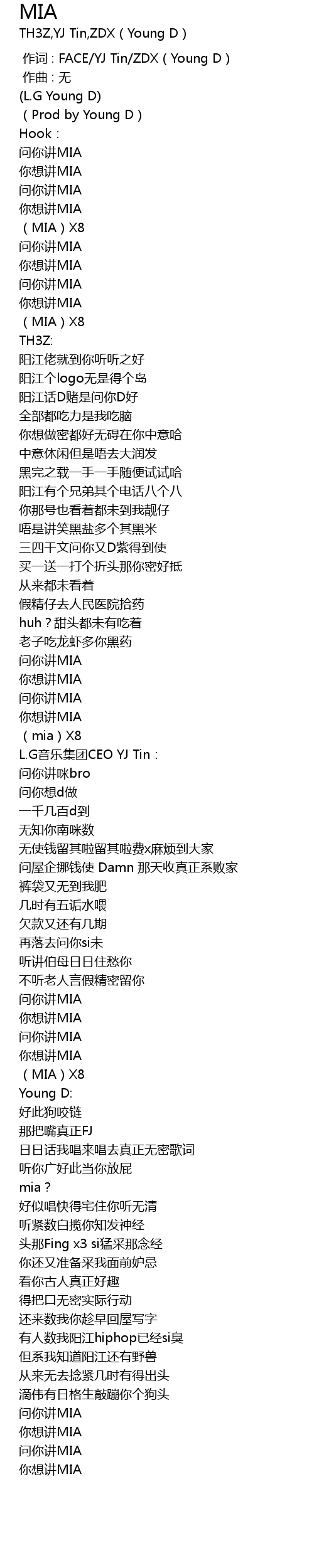 | [00:00.000] | 作词 : FACE/YJ Tin/ZDX(Young D) |