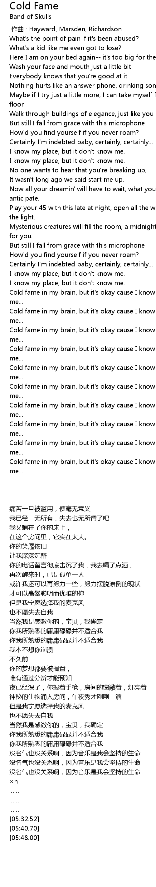 | [05:01.57] | Cold fame in my brain, but it' s okay cause I know it' s the best for me... |