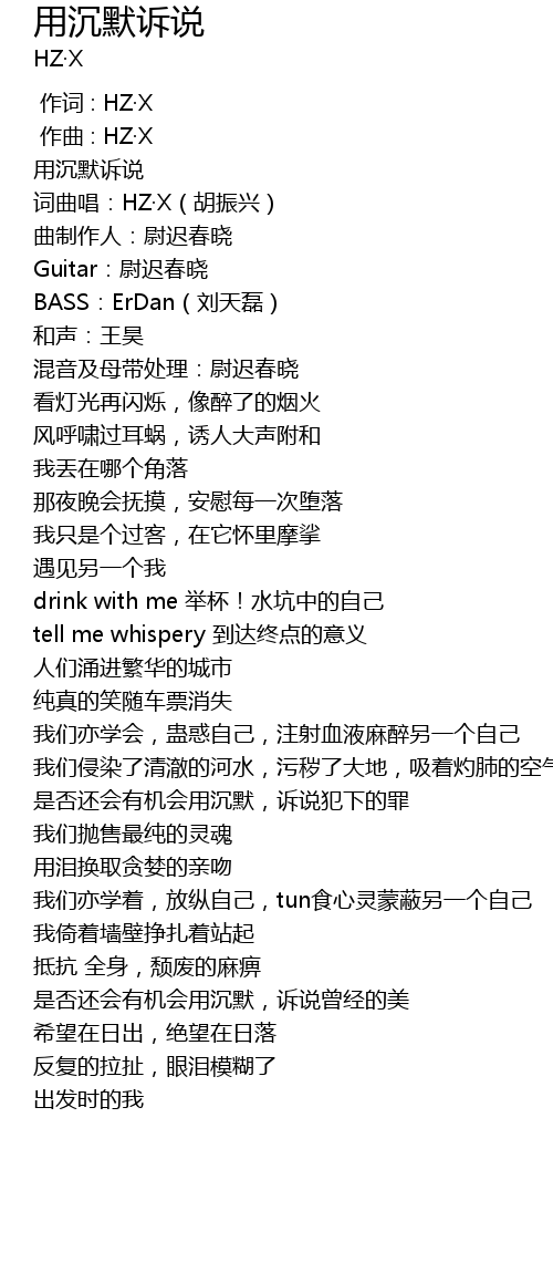 | [00:10.968] | 词曲唱:HZ·X(胡振兴) |