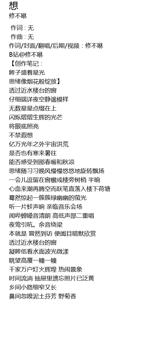 | [00:00.445] | 作词/封面/翻唱/后期/视频:修不咻 |