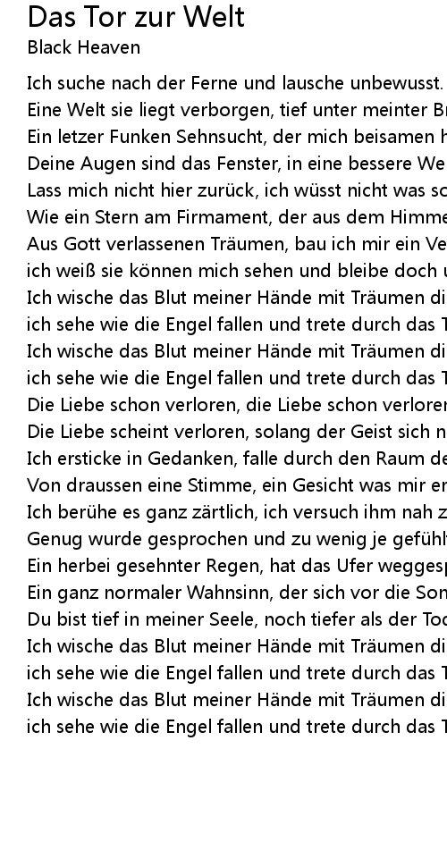 | ich sehe wie die Engel fallen und trete durch das Tor zur Welt. | |