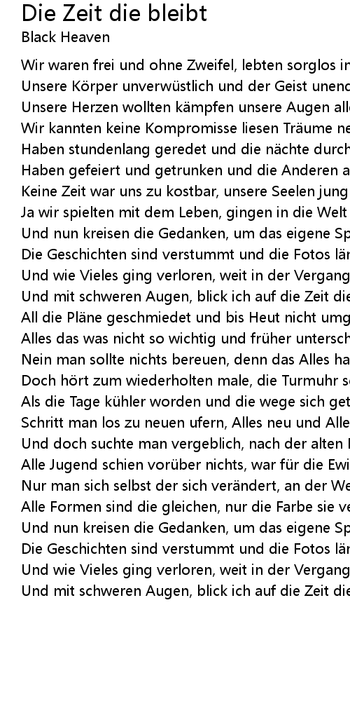 | Und mit schweren Augen, blick ich auf die Zeit die bleibt. | |