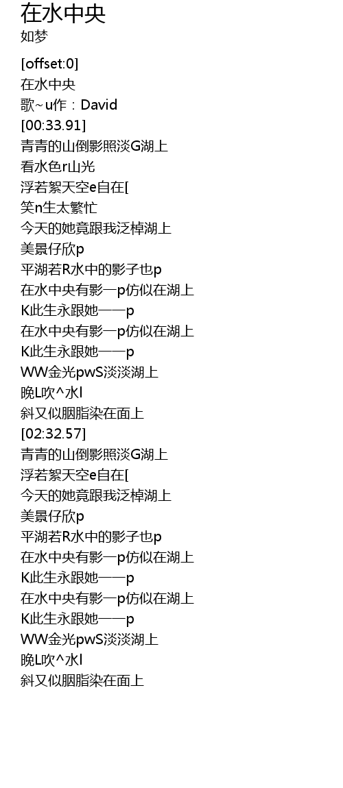 | [01:36.11] | zài shuǐ zhōng yāng yǒu yǐng yī p fǎng sì zài hú shàng |