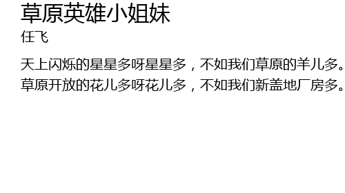 | tian shang shan shuo de xing xing duo ya xing xing duo, bu ru wo men cao yuan de yang er duo. tian bian piao fu de yun cai bai ya yun cai bai, bu ru wo men cao yuan de yang rong bai. a ha he hei a ha he hei, bu ru wo men cao yuan de yang rong bai. a a, qin ai de mao zhu xi ya mao zhu xi, cao yuan zai ni de yang guang xia xing wang, jing ai de gong chan dang ya gong chan dang, xiao mu min zai ni de jiao dao xia cheng zhang, xiao mu min zai ni de jiao dao xia cheng zhang. | |