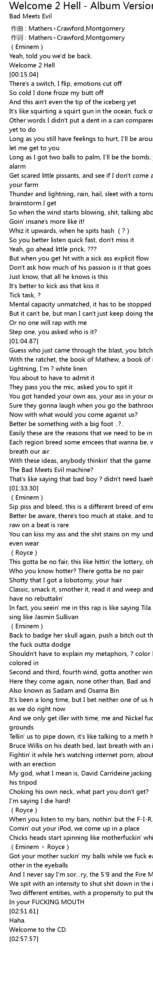| [00:13.79] | Welcome 2 Hell |