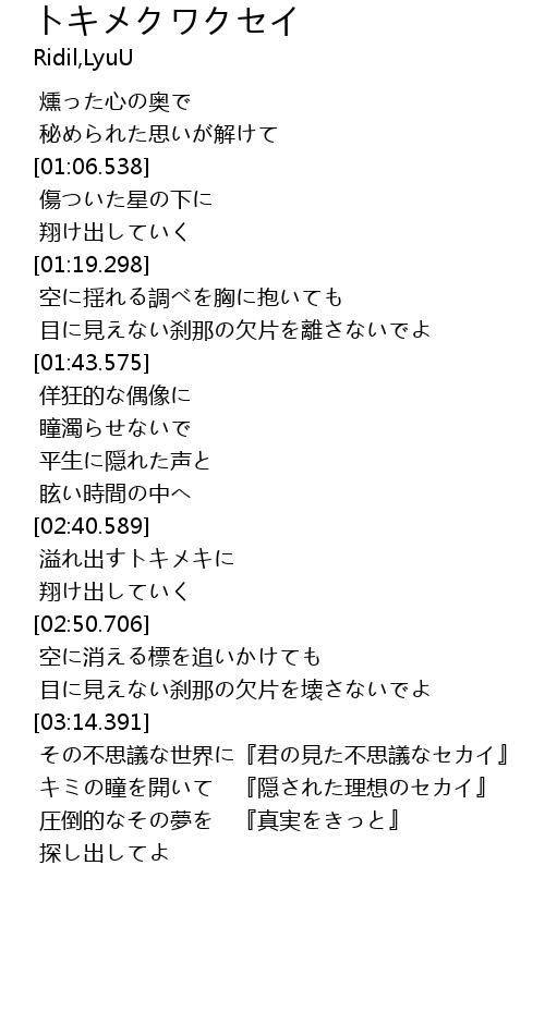 | [03:14.919] | その不思議な世界に『君の見た不思議なセカイ』 |