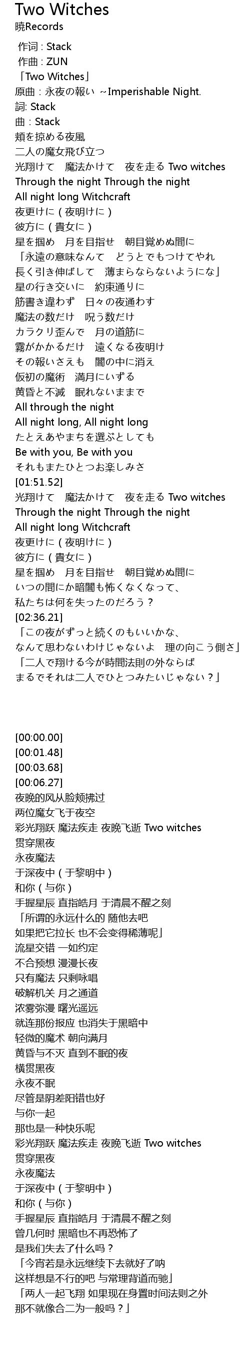 | [00:17.76] | 光翔けて 魔法かけて 夜を走る Two witches |