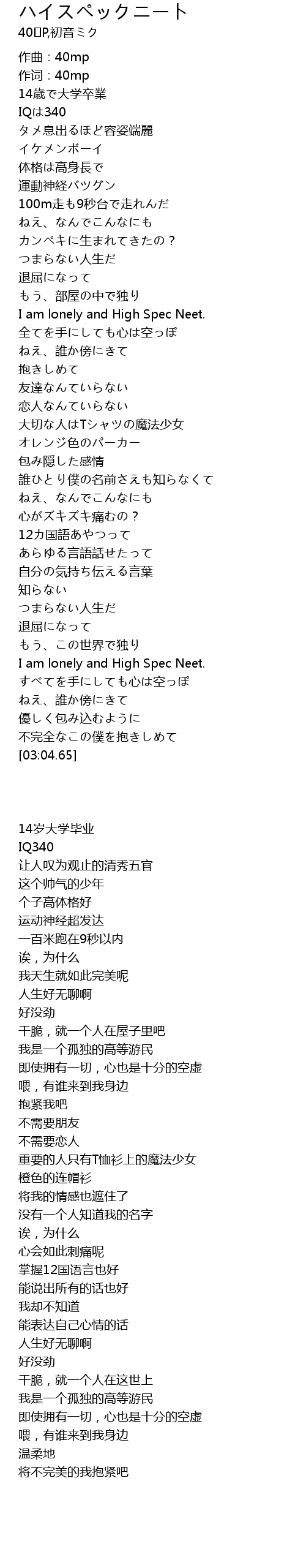 | [00:53.97] | I am lonely and High Spec Neet. |