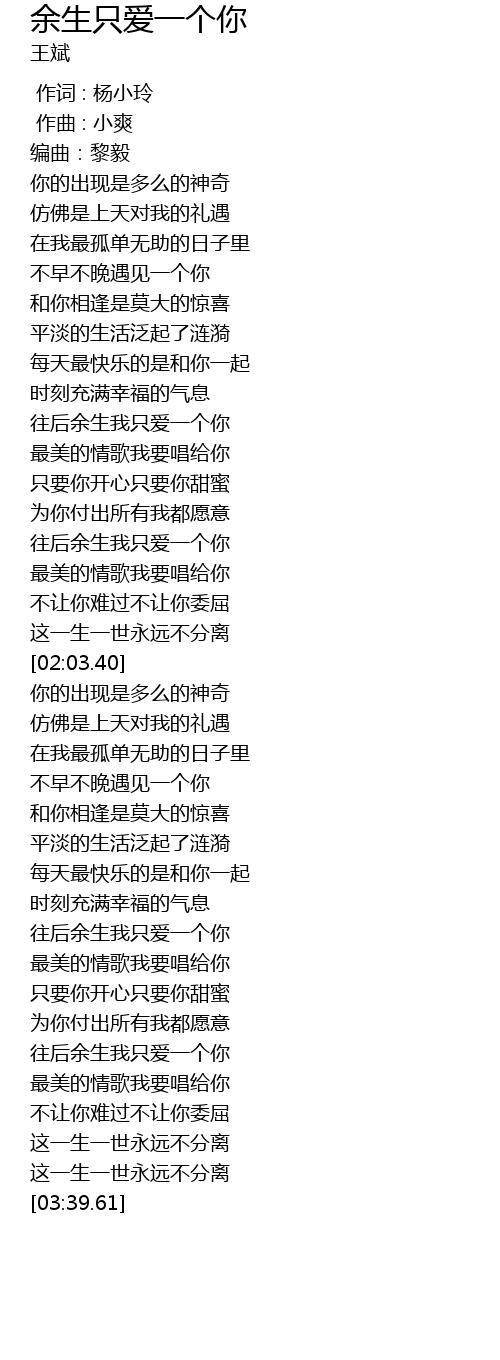 | [01:39.65] | 这一生一世永远不分离 |