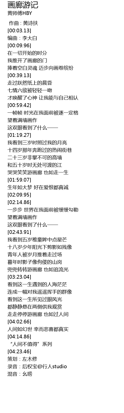 | [03:54.70] | 走走停停游画廊 也如过人间 |