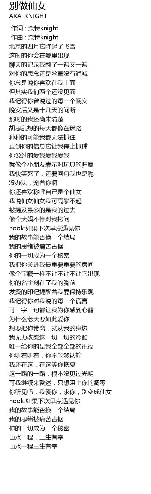 | [01:57.041] | 你听见吗,我爱你,求你,别变成仙女 |