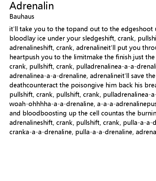 it'll take you to the topand out to the edgeshoot up needles through your bloodlay ice under your sledgeshift, crank, pullshift, crank, pulladrenaline, adrenalineshift, crank, adrenalineit'll put you through your paceskickstart your heartpush you to the limitmake the finish just the startshift, crank, pullshift, crank, pullshift, crank, pulladrenalinea-a-a-drenaline, adrenalinea-a-a-drenaline, adrenalineit'll save the life of a junkieclosing on deathcounteract the poisongive him back his breathshift, shift, crank, pullshift, crank, pullshift, crank, pulladrenalinea-a-a-drenaline, woah-ohhhha-a-a-drenaline, a-a-a-adrenalinepushing flesh and marrowkicking bone and bloodboosting up the cell countas the burning (?) is floodadrenaline, adrenalineshift, crank, pullshift, crank, pulla-a-a-drenaline, shift, cranka-a-a-drenaline, pulla-a-a-drenaline, adrenaline |