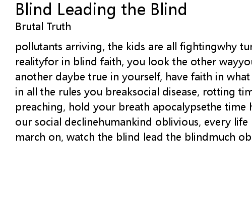 pollutants arriving, the kids are all fightingwhy turn your cheek, block realityfor in blind faith, you look the other wayyou sittin' pretty, wait until another daybe true in yourself, have faith in what you're madeact on instinct, in all the rules you breaksocial disease, rotting time awaytoo late for preaching, hold your breath apocalypsethe time has come, the breaking point in our social declinehumankind oblivious, every life runs its linetoy soldiers march on, watch the blind lead the blindmuch obliged |