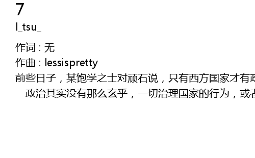 | 政治其实没有那么玄乎,一切治理国家的行为,或者维护统治的行为都是政治。由此可见,政治不光关涉国家大计、权力角逐、利益纷争,也关涉我们每个人的衣食住行、荣辱得失、喜怒哀乐。可以肯定地说,任何人都与政治密切相关。你可以不关心政治,但政治每时每刻都在关心你,决不以任何个人的意志为转移,这种关系完全不同于男女之间别人有爱的权力,你有拒绝爱的权力。 |