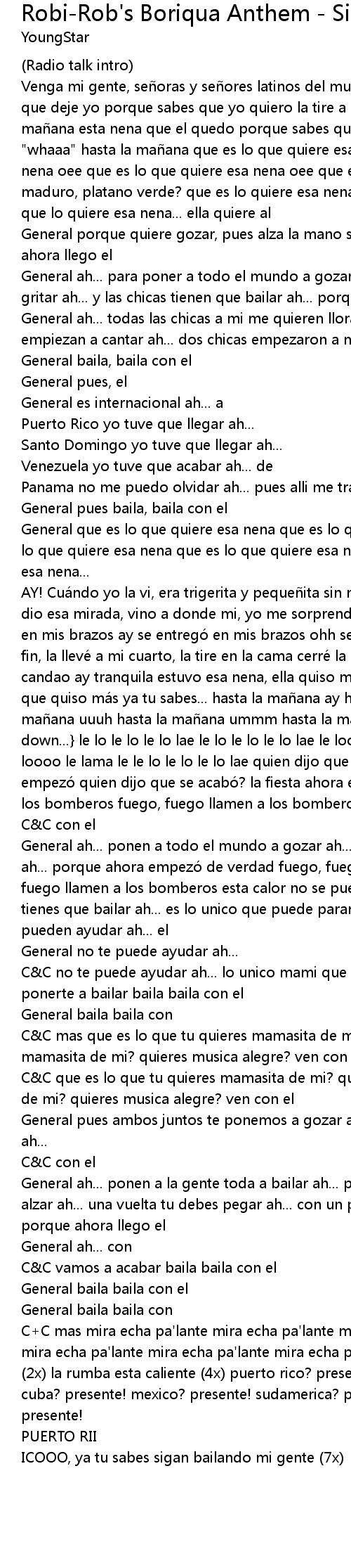 | AY! Cuándo yo la vi, era trigerita y pequeñita sin negro estaba y una vez, me dio esa mirada, vino a donde mi, yo me sorprendi, ay! ya tu sabes... se entregó en mis brazos ay se entregó en mis brazos ohh se entregó en mis brazos ay por fin, la llevé a mi cuarto, la tire en la cama cerré la puerta con tó el candao ay tranquila estuvo esa nena, ella quiso más porque el rey da mas, ay que quiso más ya tu sabes... hasta la mañana ay hasta la mañana ohh hasta la mañana uuuh hasta la mañana ummm hasta la mañanaaaaa wooow {2 minute break down...} le lo le lo le lo lae le lo le lo le lo lae le loooo le lama le le loooo le lama le le lo le lo le lo lae quien dijo que se acabó? la fiesta ahora empezó quien dijo que se acabó? la fiesta ahora empezó fuego, fuego llamen a los bomberos fuego, fuego llamen a los bomberos | |