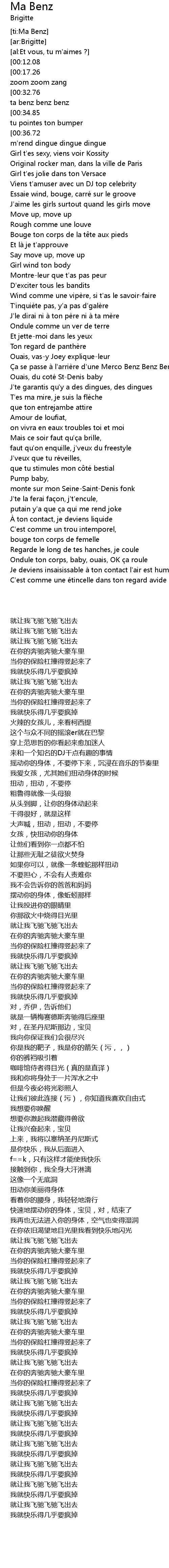 | [00:25.00][00:32.76][01:34.74][01:42.44][02:52.11][03:00.01][03:07.75][03:15.54] | Dans ta benz benz benz |
