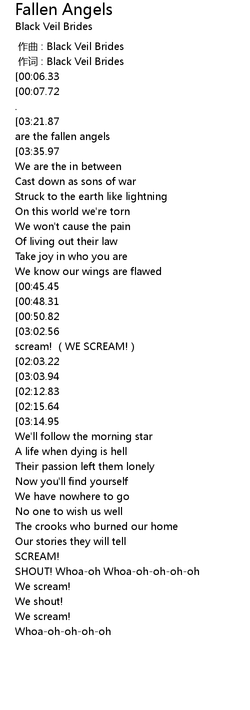| [03:38.74][03:21.87][03:16.27][02:59.79][02:48.77][02:21.11][02:04.59][01:14.94][00:58.40][00:08.75] | We are the fallen angels |