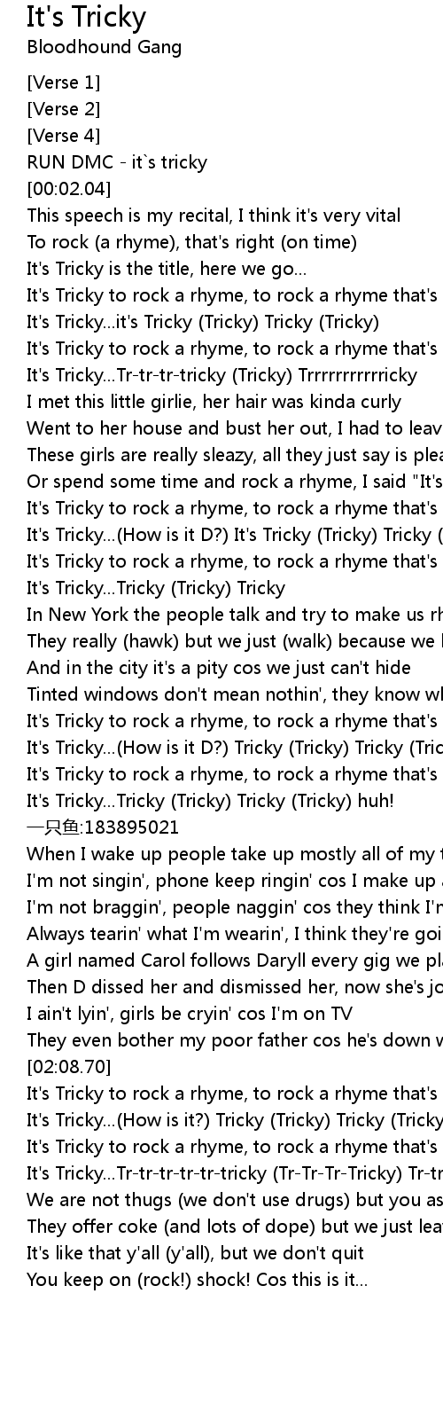 | [02:22.37] | It's Tricky...Tr-tr-tr-tr-tr-tricky (Tr-Tr-Tr-Tricky) Tr-tr-tr... |