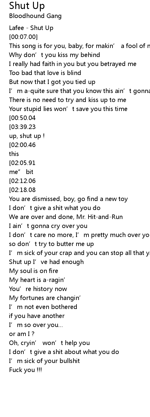 | [03:45.59][03:39.23][03:33.76][03:27.98][03:21.24][03:15.29][03:09.20][03:03.53][02:15.15][02:09.40][02:03.10][01:57.80][01:08.79][01:03.18][00:56.96][00:51.56] | Shut up, shut up ! |