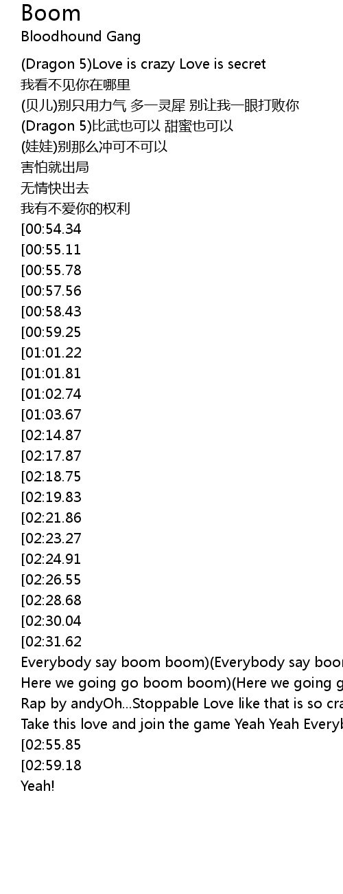 | [02:37.24][02:17.87][01:09.50] | Boom boom boom xin li |