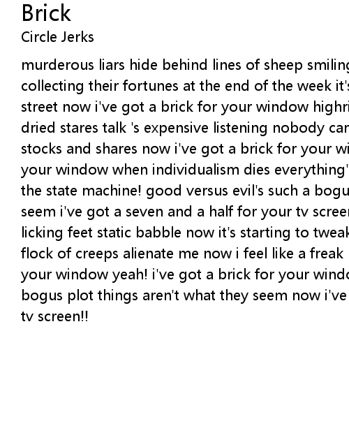 murderous liars hide behind lines of sheep smiling killers find it easy to sleep collecting their fortunes at the end of the week it's sixty five on a one way street now i've got a brick for your window highrise hogwash dealt to freeze dried stares talk 's expensive listening nobody cares cram those bank account's stocks and shares now i've got a brick for your window now i've got a brick for your window when individualism dies everything's the same you can kiss my ass to the state machine! good versus evil's such a bogus plot things aren't what they seem i've got a seven and a half for your tv screen! herds of paper eaters licking feet static babble now it's starting to tweak company kept is just a flock of creeps alienate me now i feel like a freak now i've got a brick for your window yeah! i've got a brick for your window good versus evil's such a bogus plot things aren't what they seem now i've got a seven and a half for your tv screen!! |