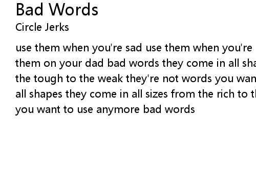 | use them when you're sad use them when you're mad use them when you're happy use them on your dad bad words they come in all shapes they come in all sizes from the tough to the weak they're not words you want to speak bad words they come in all shapes they come in all sizes from the rich to the poor they're not words you want to use anymore bad words |