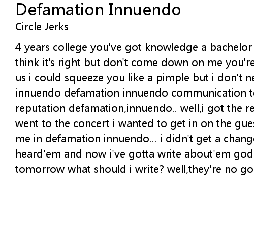 4 years college you've got knowledge a bachelor degree you read and write you think it's right but don't come down on me you're an educated jerk write about us i could squeeze you like a pimple but i don't need the pus defamation innuendo defamation innuendo communication to third person it's defamation my reputation defamation,innuendo.. well,i got the record i haven't heard it yet i went to the concert i wanted to get in on the guest list but they wouldn't let me in defamation innuendo... i didn't get a change to see the band hell,i never heard'em and now i've gotta write about'em god,the story is due, the story's due tomorrow what should i write? well,they're no good !