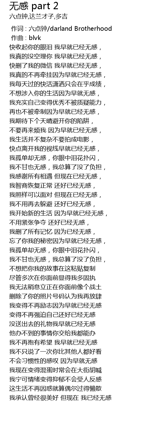 | [00:00.000] | 作词 : 六点钟/darland Brotherhood |