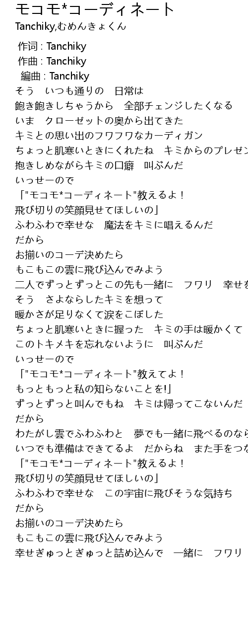 | [00:58.86] | 「"モコモ*コーディネート"教えるよ! 飛び切りの笑顔見せてほしいの」 |