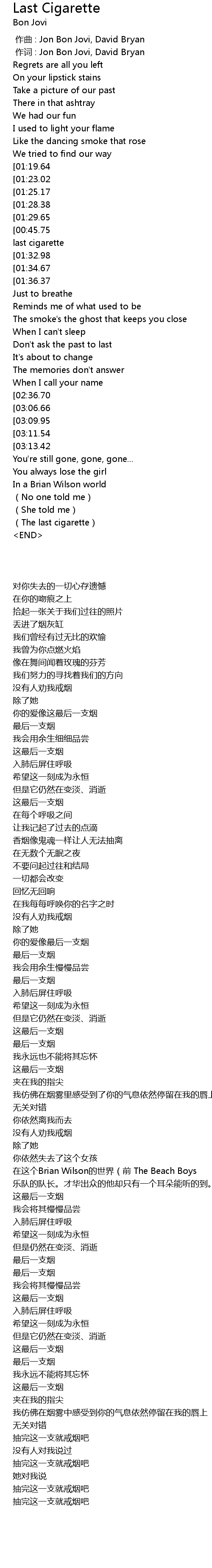 | [00:35.72][01:28.38][01:41.70][02:51.94][03:05.29] | Last cigarette |