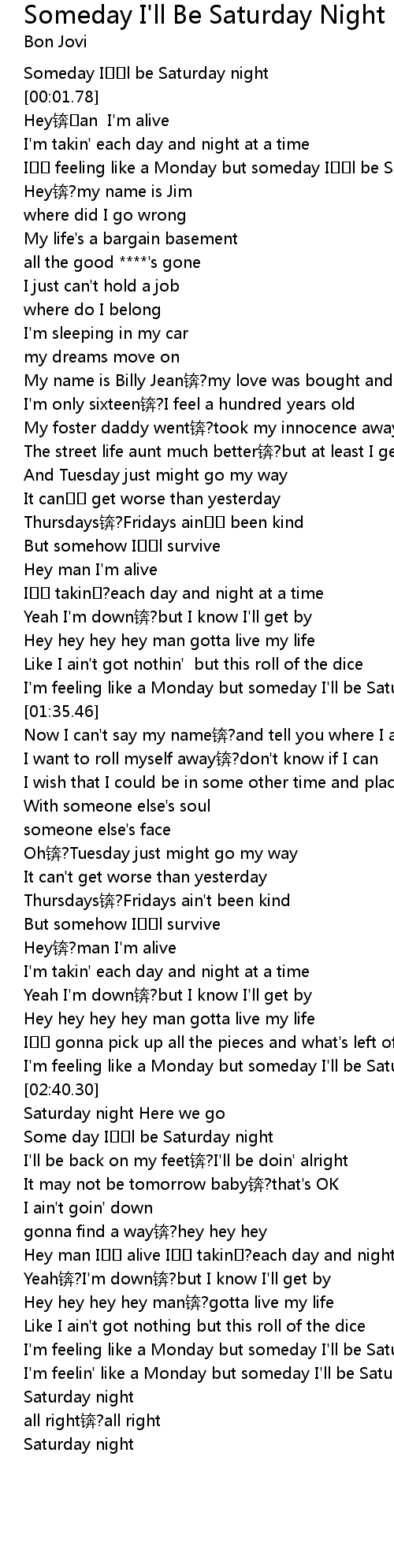 | [03:45.14] | I'm feeling like a Monday but someday I'll be Saturday night |