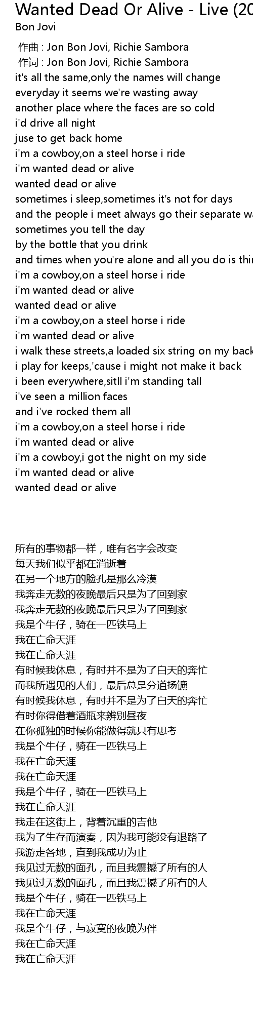 | Song | Wanted Dead Or Alive - Live (2000/China Club) |
