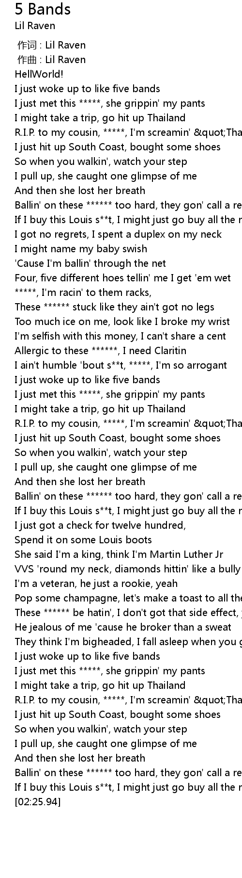 | [02:10.06] | R.I.P. to my cousin, *****, I'm screamin' "Thailand" |