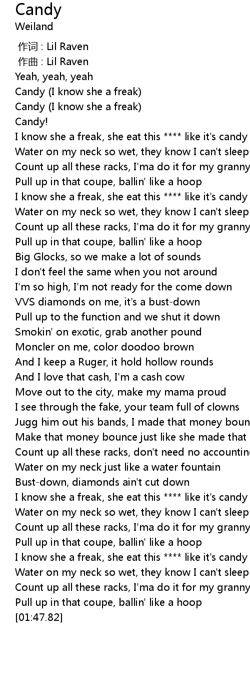 | [01:23.98] | I know she a freak, she eat this like it 39 s candy |